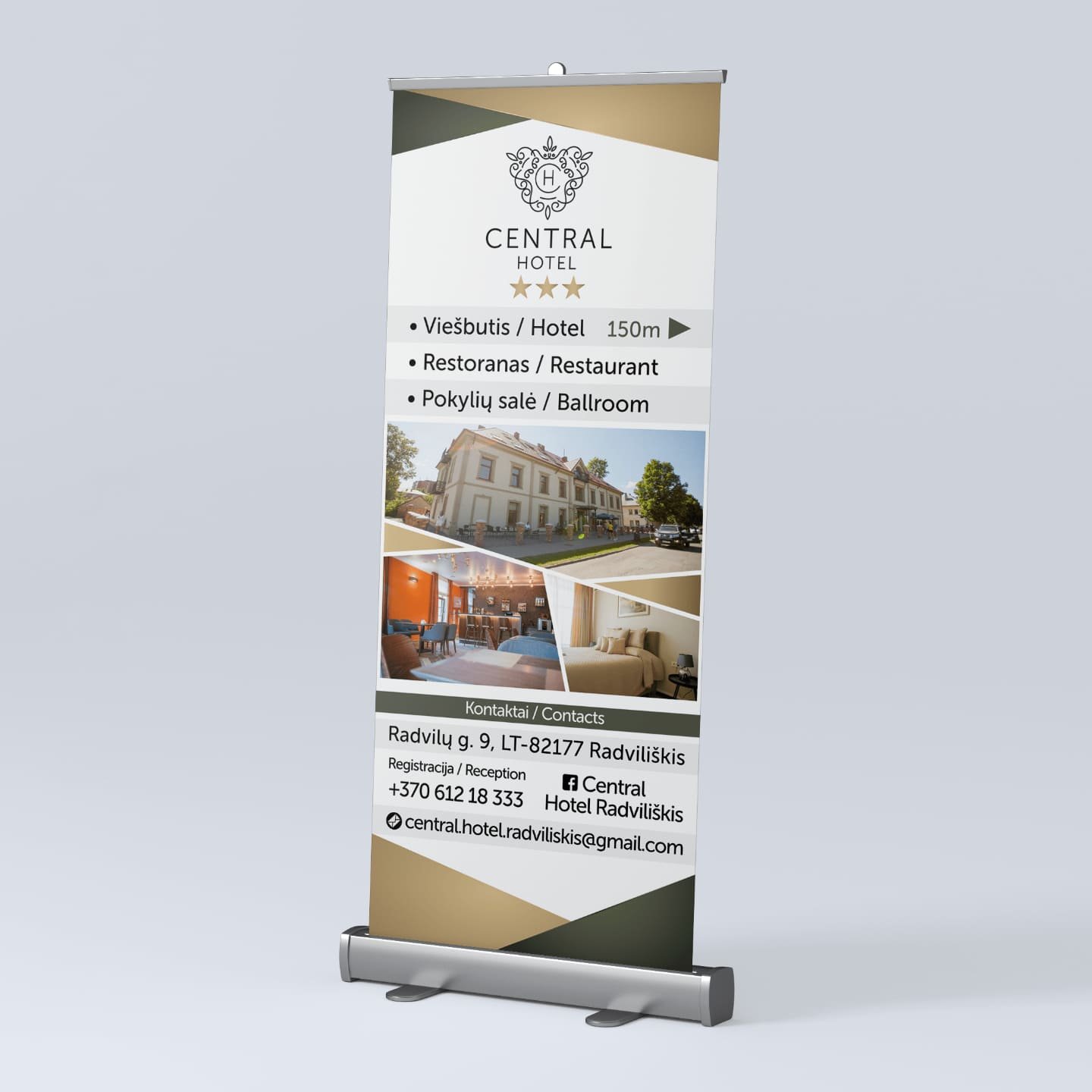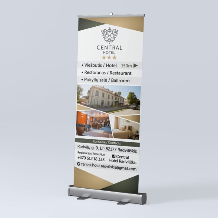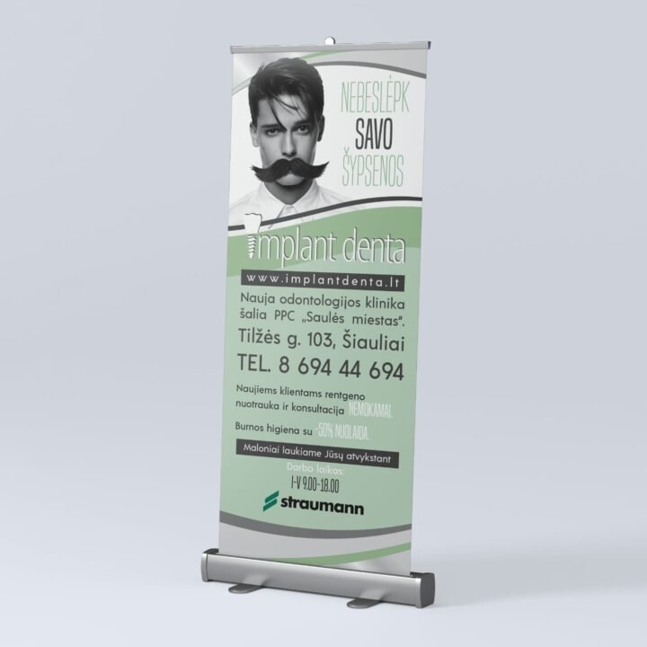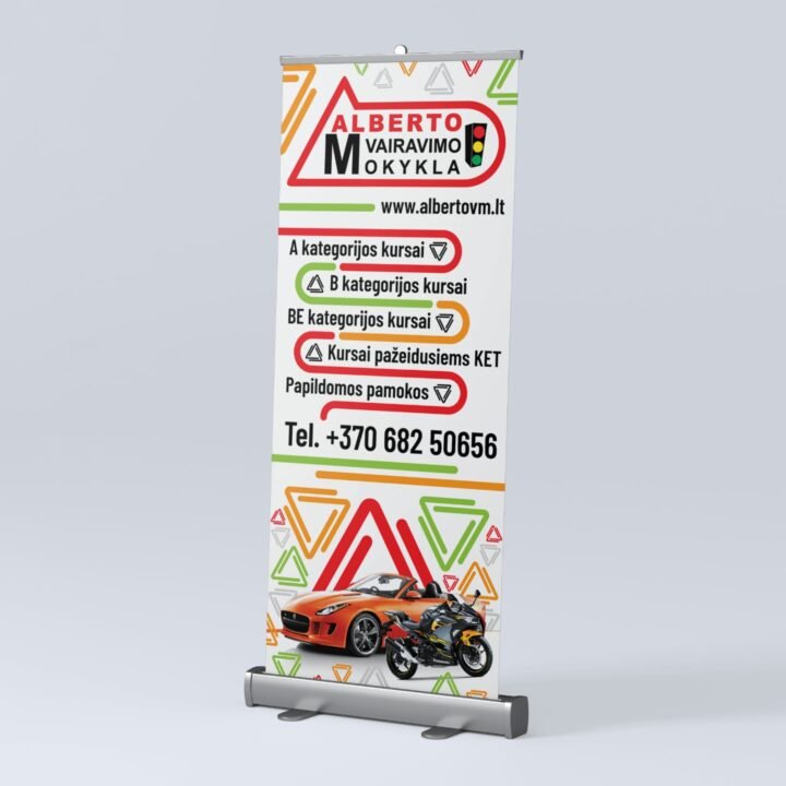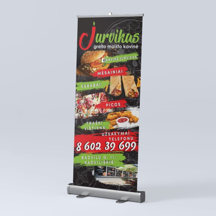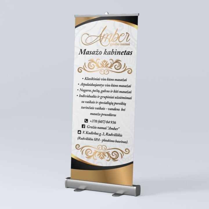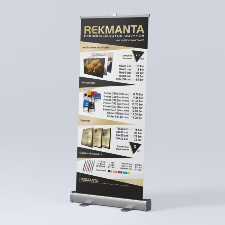 Dažnas užsakymas – mobilūs ištraukiami “Roll up” stendai, kuriuos sumaketuoju, atspausdinu plačiaformačiu spausdintuvu bei priklijuoju prie konstrukcijos.