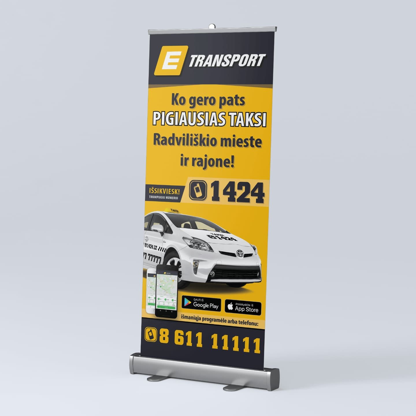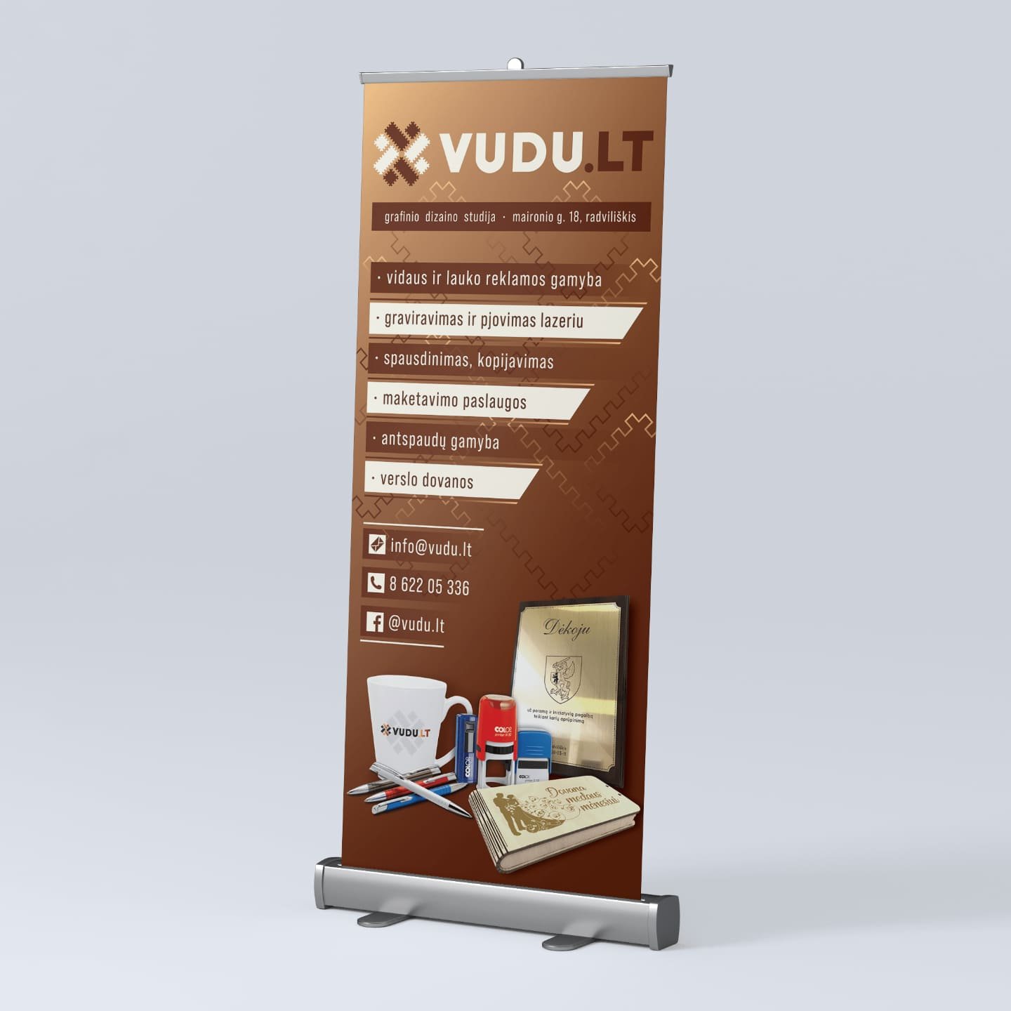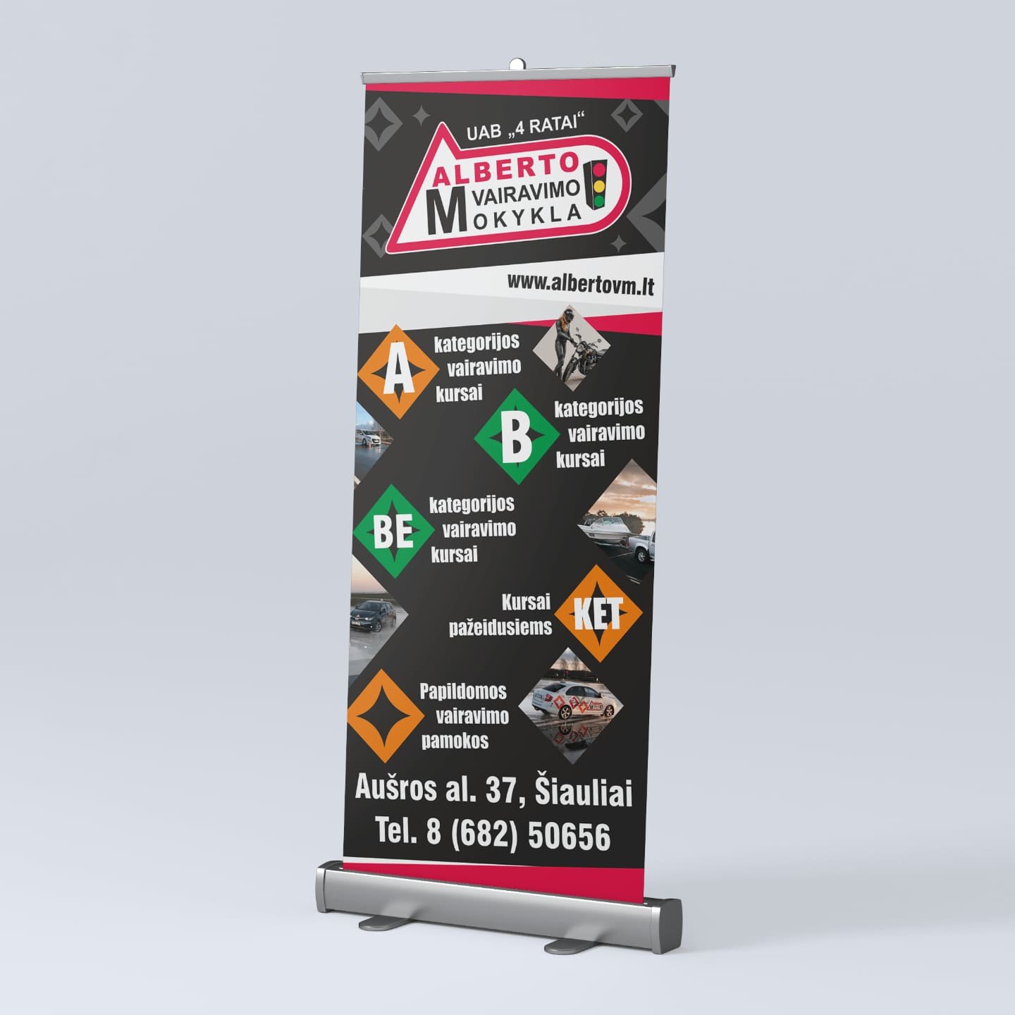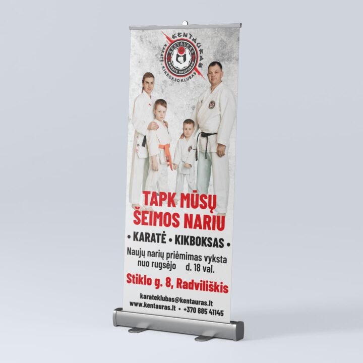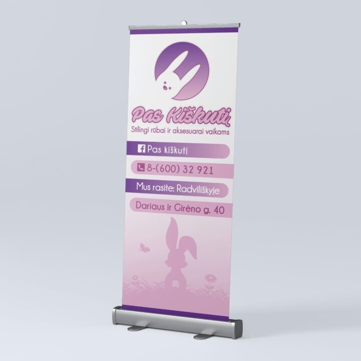 Dažnas užsakymas – mobilūs ištraukiami “Roll up” stendai, kuriuos sumaketuoju, atspausdinu plačiaformačiu spausdintuvu bei priklijuoju prie konstrukcijos.